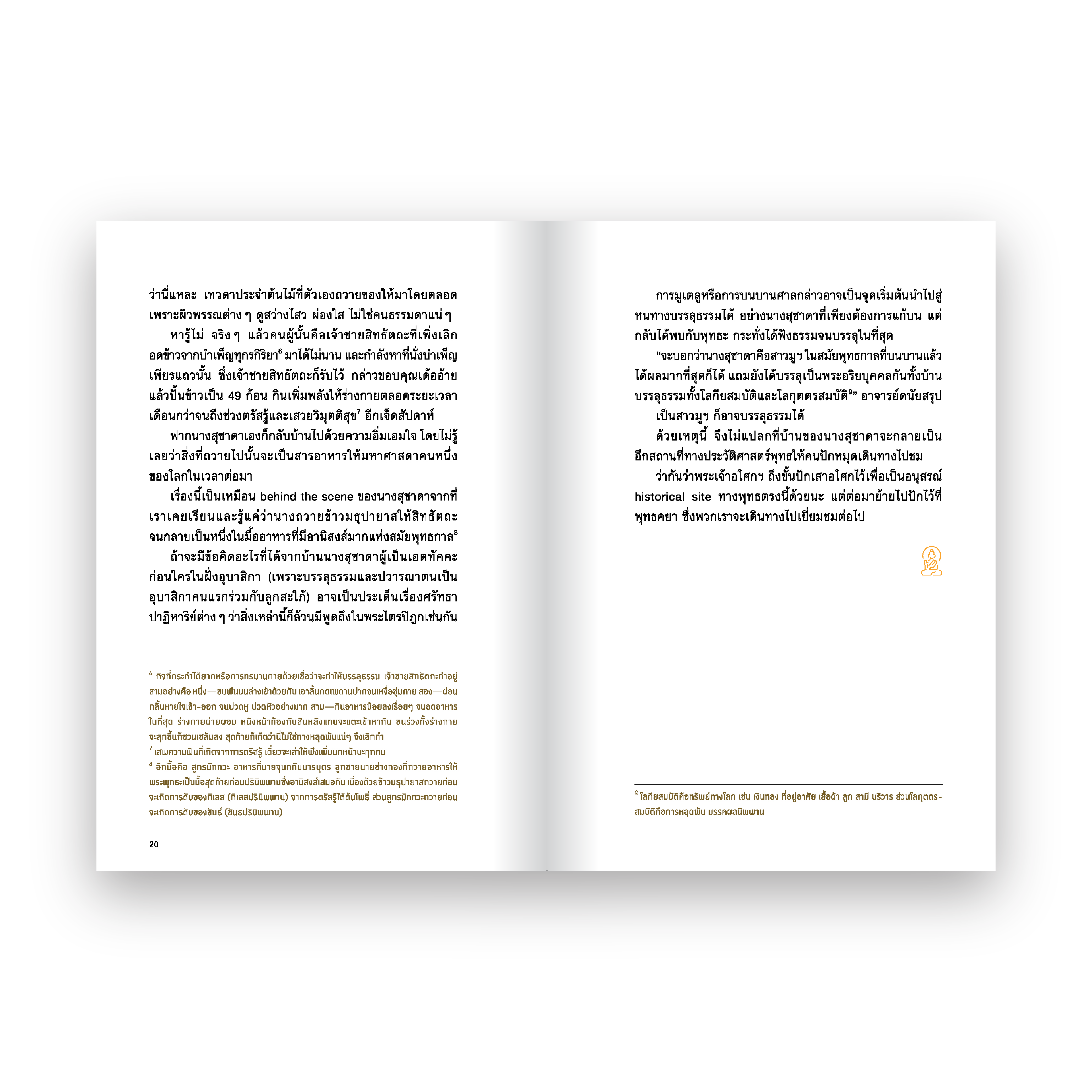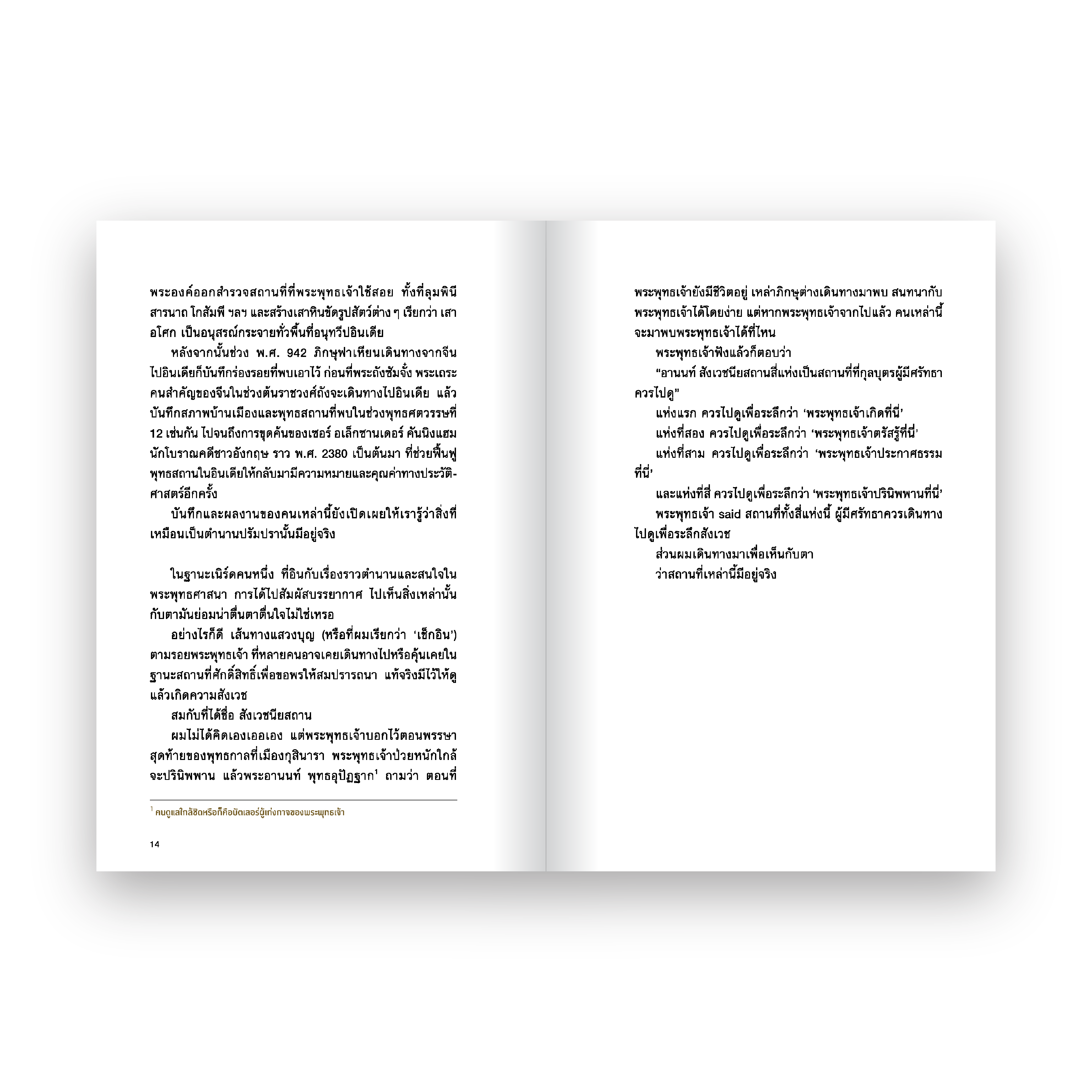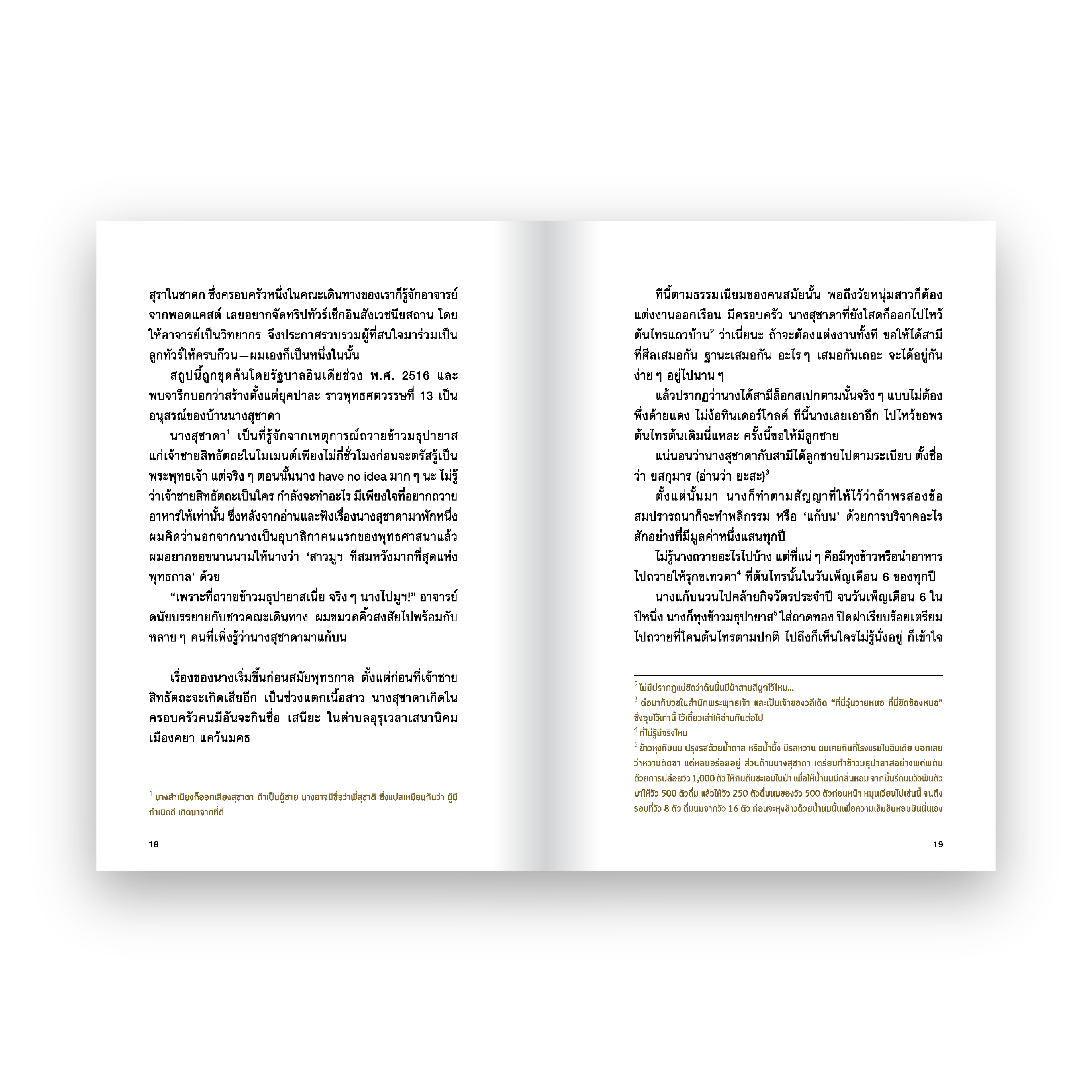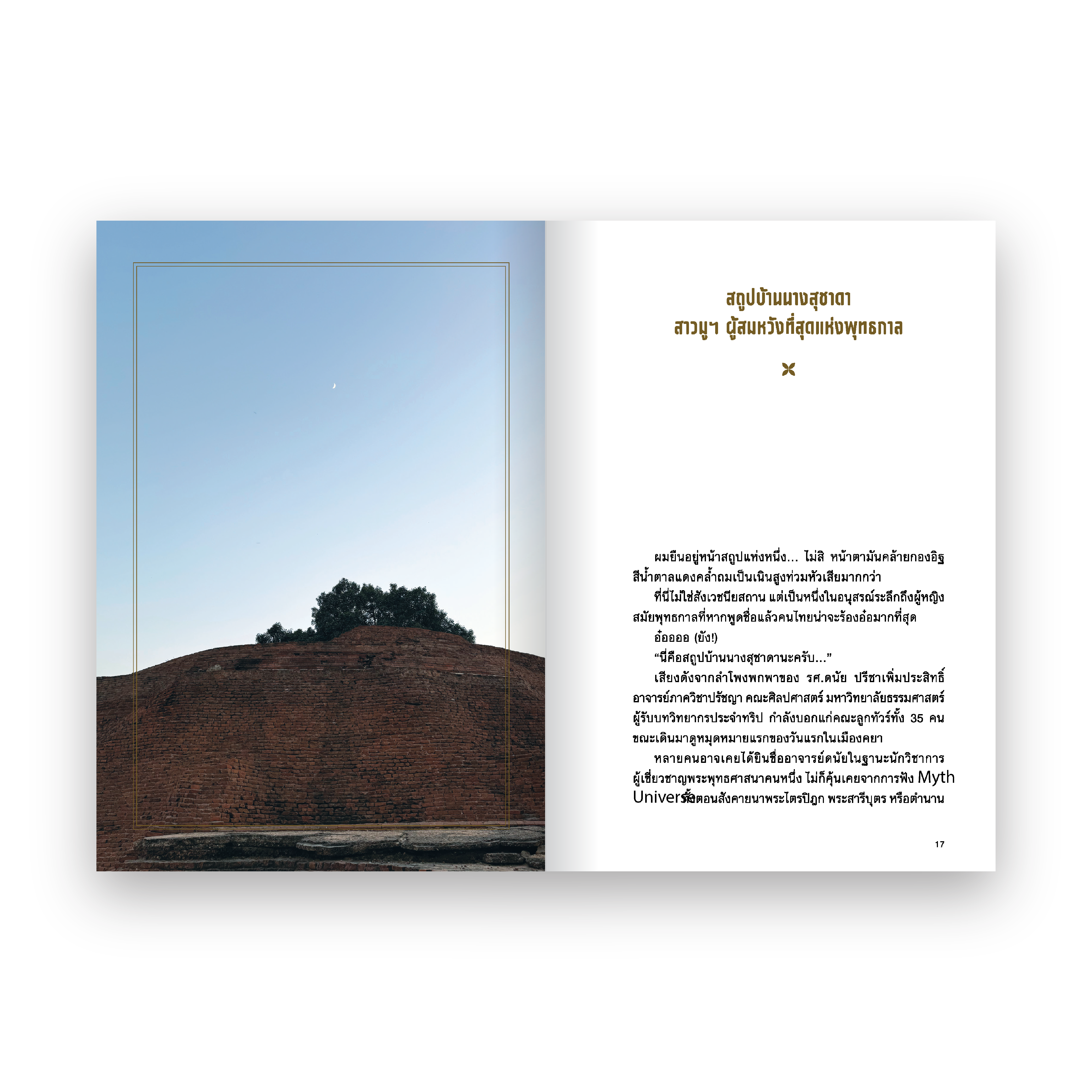 พร้อมกับการขุดหาตำนาน ชาดก และเรื่องเล่าในอดีตที่ทิ้งร่องรอยไว้ผ่านเมือง สิ่งปลูกสร้างและซากปรักหักพังระหว่างทาง ไม่ว่าจะเป็นเรื่องของสาวมูฯ ผู้สมหวังที่สุดแห่งพุทธกาล ชีวิตตอนตรัสรู้ที่ต้องสู้กับใจและมารผจญ เหตุผลที่ต้องยุติการทำงานที่เมืองเล็กอย่างกุสินารา ตัวต้นเรื่องให้เกิดสังคายนาครั้งแรก เรื่องเล่าแก๊งพระที่อยู่ใกล้ชิดศาสดา และสารพัดเกร็ดเกาะเกี่ยวศาสนาและประวัติศาสตร์