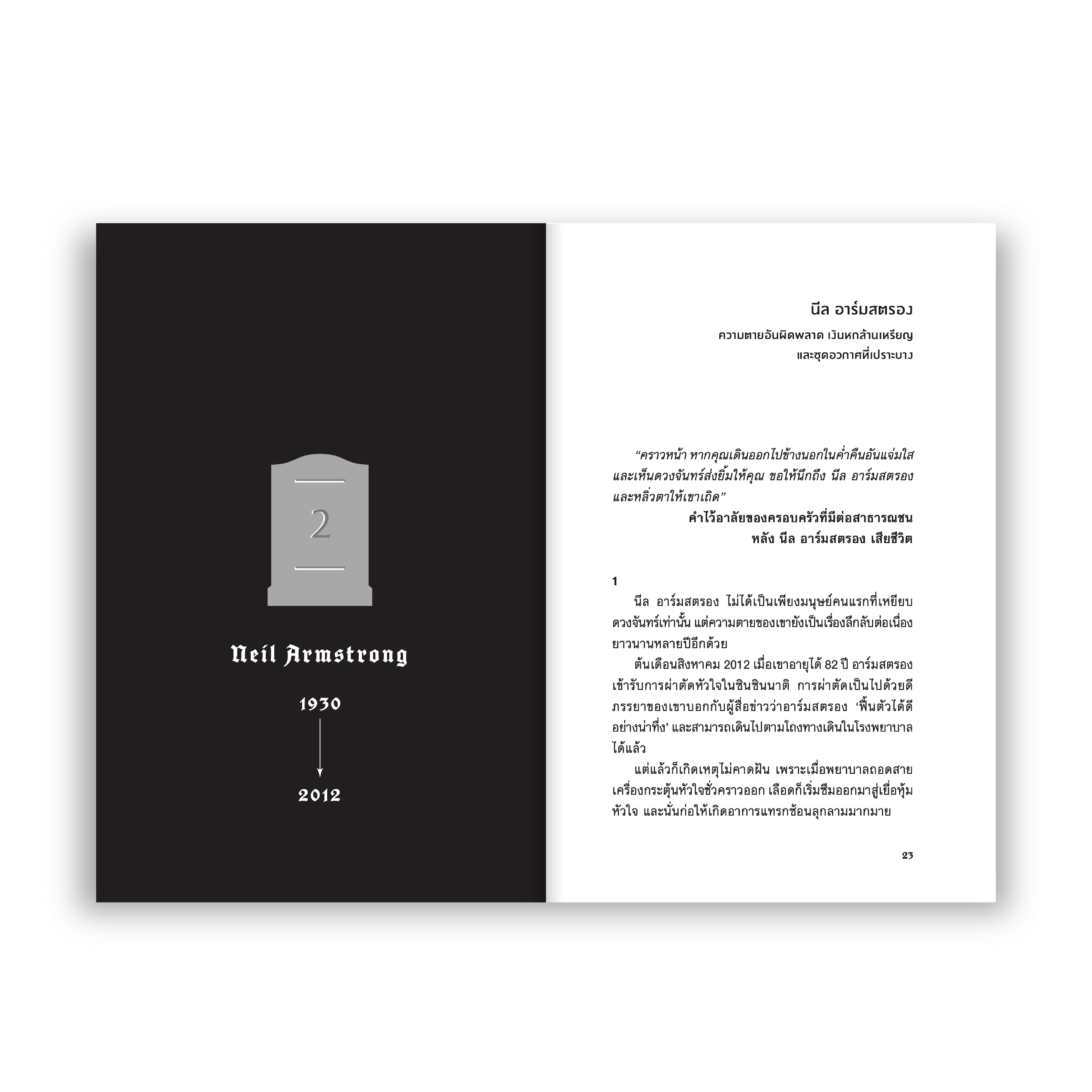 25 เรื่องเล่าก่อนความตายของบุคคลในหน้าประวัติศาสตร์โลก ความเรียงคัดสรรจากเว็บไซต์ The MATTER โดย โตมร ศุขปรีชา นักเล่าเรื่องและบรรณาธิการที่จะชวนไปสำรวจชีวิตในยามสุดท้ายของเหล่าบุคคลผู้จากไป หากเรื่องราวยังคงอยู่ และควรค่าแก่การรับรู้ ทั้งนักร้อง-นักแสดงชื่อดัง นักประดิษฐ์ที่มีชื่อเสียง และอีกสารพัดบุคคลในหน้าประวัติศาสตร์ ไม่ว่าจะเป็น สตีฟ จอบส์, นีล อาร์มสตรอง, ฮีธ เลดเจอร์, ชาร์ลี แชปลิน, แอนดี วอร์ฮอล, นิโคลา เทสลา ไปจนถึง เพลโต
