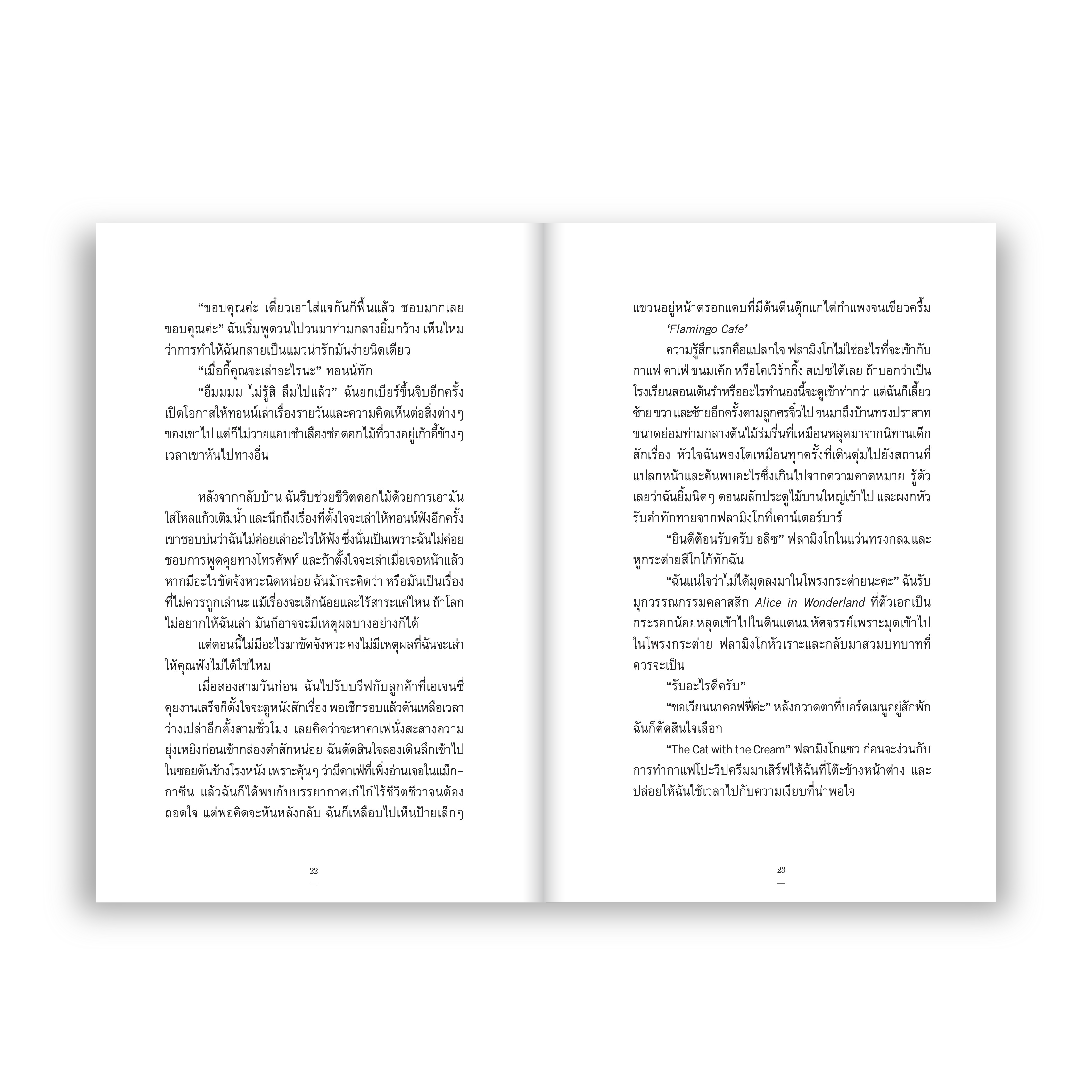 นวนิยายเล่มแรกของ ‘จิราภรณ์ วิหวา’ ที่จะพาคุณเข้าสู่โลกของเหล่าสัตว์ที่ต่างก็มีความรักความฝันเช่นมนุษย์ทั่วไป เมื่อ ‘มี’ แมวสาวนักเขียน ได้พบกับ ‘รติ’ ฟลามิงโกหนุ่มนักธุรกิจผู้นำความลับบางอย่างมาเปิดเผยกับเธอ มีก็มองสัตว์รอบข้างเปลี่ยนไป เพราะมันไม่ใช่แค่ความลับของฟลามิงโกหนุ่ม หากแต่เป็นความลับที่จะสั่นคลอนสัตว์ทุกตัว ไม่เว้นแม้แต่เธอกับแฟนหนุ่มนักดนตรี