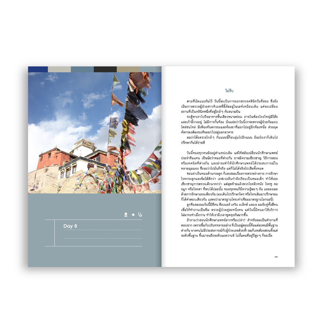 บันทึกการเดินทางไปค่ายแพทย์อาสาในโครงการ Himalayan Health Exchange ณ เทือกเขาหิมาลัย ของ ‘คัมภีร์ สรวมศิริ’ นักเขียน นักเดินทาง ผู้มีอาชีพหลักเป็นแพทย์เวชศาสตร์ฉุกเฉิน ซึ่งตัดสินใจพักการงานหลักไว้ชั่วคราว แล้วออกเดินทางไปพร้อมกับหูฟังและความเชี่ยวชาญทางการแพทย์ โดยมีเป้าหมายคือช่วยตรวจสุขภาพให้กับผู้คนที่อยู่ห่างไกลและไม่อาจเข้ารับบริการทางแพทย์ได้สะดวก หากนั่นก็ยังเป็นการทำงานที่ทำให้เขาได้พบกับเพื่อนร่วมอาชีพต่างเชื้อชาติ ได้เห็นวิธีคิด วิธีการทำงาน และวิถีชีวิตใหม่ๆ จนทำให้เขาได้ยินเสียงหัวใจตัวเองชัดเจนมากขึ้น